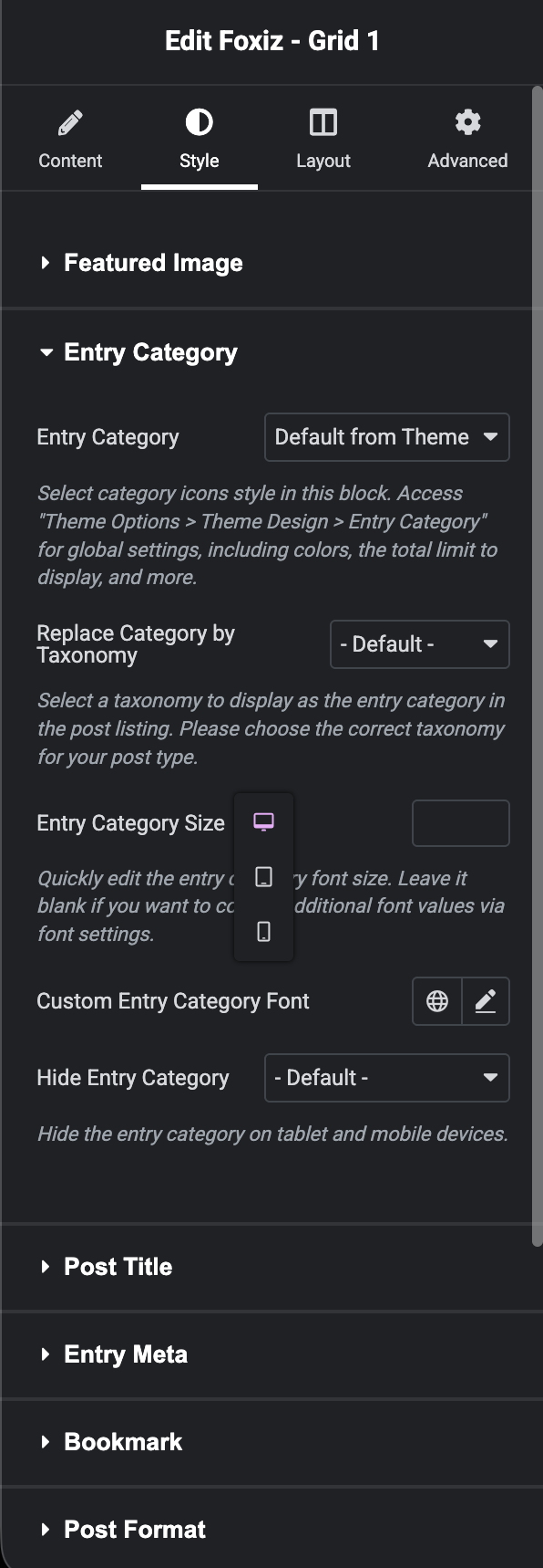 There, you will find options to customize each element individually, such as images, categories, meta info, and text, including font size settings for different devices (desktop, tablet, mobile).